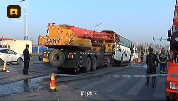 实拍沈阳大吊车追尾通勤车 吊臂直插入客舱致1死多伤