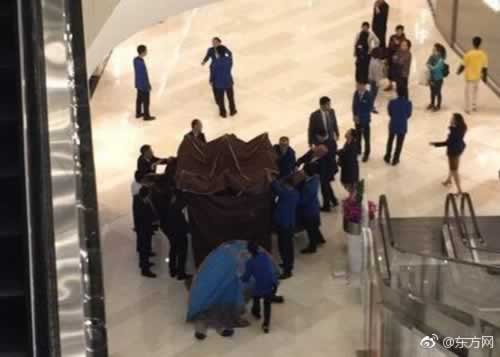 从网络上流传的现场照片来看,一男子趴在地上,身边有血迹,旁边另有一女子跪趴在地上。另一张照片显示,商场管理人员在尸体周边架起围挡。