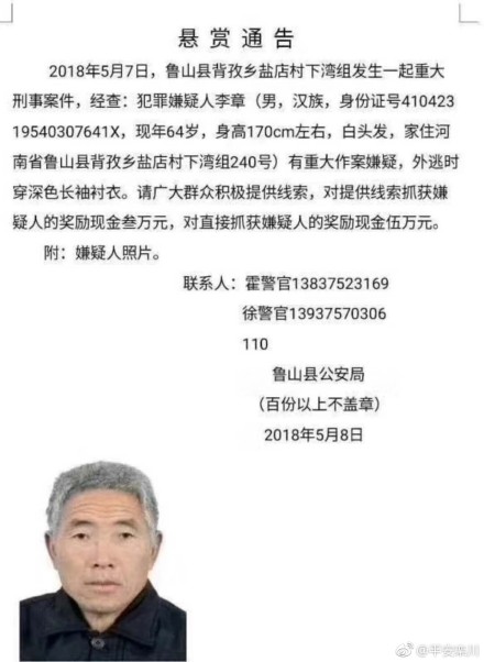 河南鲁山背孜乡盐店村发生命案 警方悬赏5万缉拿嫌犯李章