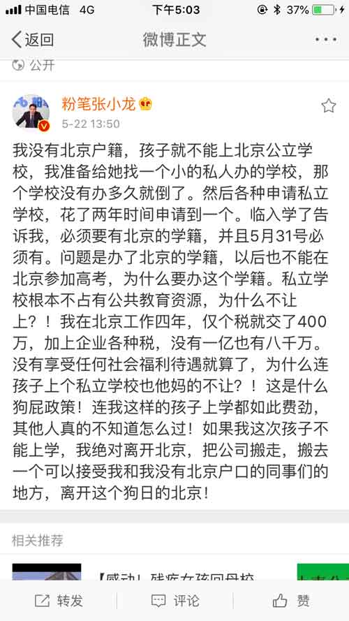 北京粉笔蓝天科技有限公司CEO张小龙22日在微博上公开发文,质问北京学籍政策。