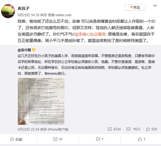 网友@麦苏子:我靠,卷完钱了还这么忍不住。染香 可以说是微博黄金时段最让人作呕的一个ID了,还有很多打他旗号的假ID,但那又怎样,骂他的人都还继续吸着雾霾,人却在美国岁月静好了。你们气不气//@李南心在企鹅岛: 原博是染香,著名爱国自干五正能量偶像。周小平几乎是她孙辈了。爱国韭菜割完了是时候移民美国了。