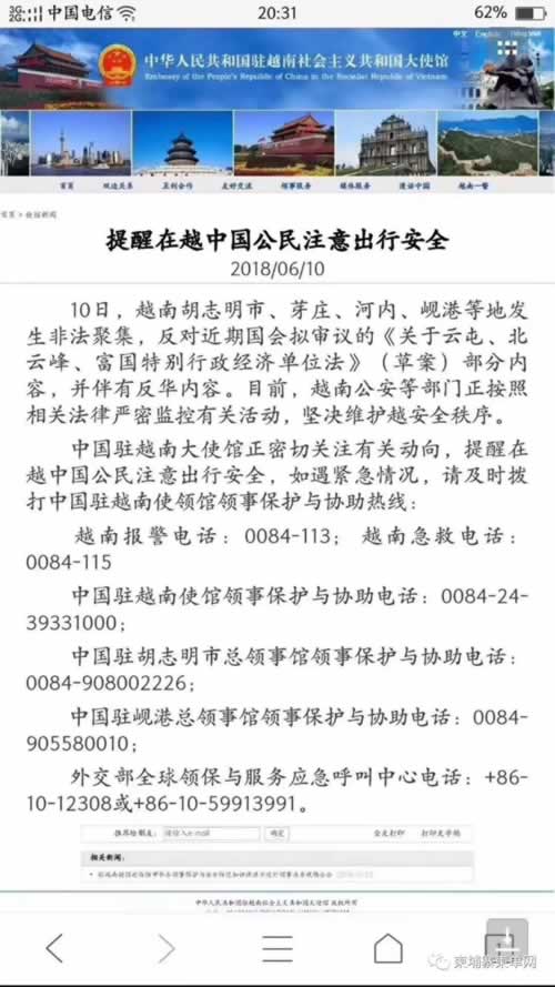 中国驻越南使馆领事保护与协助电话:0084-24-39331000;
