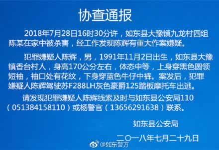2018年7月28日16时30分许,如东县大豫镇九龙村四组陈某在家中被杀害,经工作发现陈辉有重大作案嫌疑。犯罪嫌疑人陈辉,男,1991年11月2日出生,如东县大豫镇香台村人,身高170公分左右,体态中等,上身穿黑色圆领短袖,袖口处有花纹,下身穿蓝色牛仔中裤。案发后,犯罪嫌疑人陈辉驾驶苏F288LH灰色豪爵125踏板摩托车出逃。请发现犯罪嫌疑人陈辉线索及时与如东县公安局110