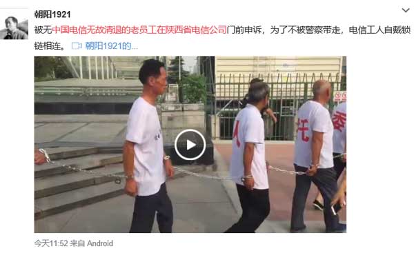 据网友@朝阳1921微博曝料:被无中国电信无故清退的老员工在陕西省电信公司门前申诉,为了不被警察带走,电信工人自戴锁链相连。
