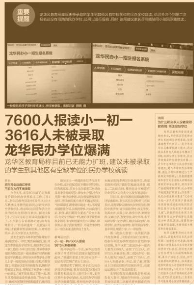 2018年8月1日,深圳《南方都市报》的一则报道,印象中公立学校才会学位紧缺,而现在民办学校也是一样,今年龙华区报名小学一年级和初中一年级的学生,7600多人报名民办学校,竟然有3600多人未能报名成功,
