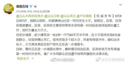 汕头市潮南区政府8日上午对外发布通报,称今天早晨5时许,接群众报称,该区井都镇神山社区一民宅发生火灾。接报后,潮南区委、区政府高度重视,区委、区政府主要领导等有关领导第一时间赶赴现场指挥处置工作,组织力量全力灭火。
