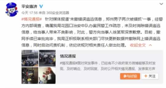 8月7日,针对媒体报道“未撤错误追逃信息,郑州男子两次被错抓”一事,郑州市长兴路派出所官方微博@平安惠济 发布了情况通报: