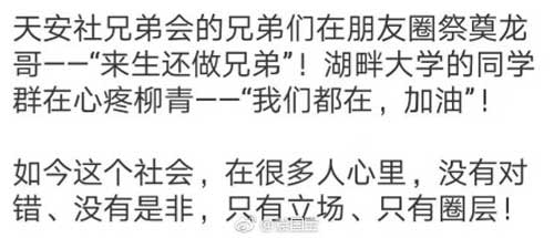天安社兄弟会的兄弟们在朋友圈祭奠龙哥--“来生还做兄弟”!滴滴出了人命,柳青一道歉,湖畔大学的人纷纷为柳青点赞:“心疼柳青”、“我们都在,加油”!王志安忍无可忍发博痛批!如今这个社会,在很多人心里,没有对错、没有是非,只有立场、只有圈层!哀哉!