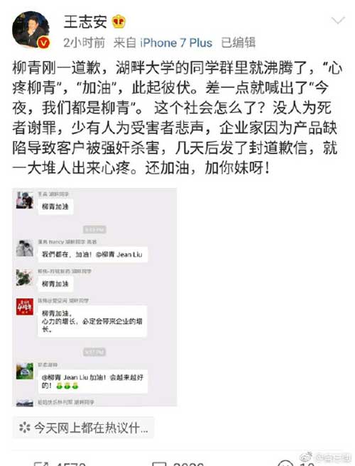 柳青刚一道歉,湖畔大学的同学群里就沸腾了,“心疼柳青”,“加油”,此起彼伏。差一点就喊出了“今夜,我们都是柳青”。 这个社会怎么了?没人为死者谢罪,少有人为受害者悲声,企业家因为产品缺陷导致客户被强奸杀害,几天后发了封道歉信,就一大堆人出来心疼。还加油,加你妹呀!