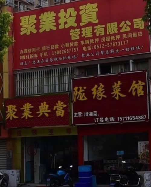 网传这家典当行与开在楼上是一家名叫“聚业投资有限公司”关系密切。据每日人物了解,聚业公司成立于2015年4月,主营业务是办信用卡、银行贷款、车辆抵押、民间借贷等。