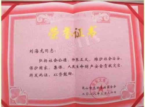 3月27日,陆家派出所见义勇为工作站为刘海龙和于某某的表现,申报了见义勇为。3月的最后一天,刘海龙获颁了“见义勇为”荣誉证书,以及500元的奖励。烫金的证书内页写着:“刘海龙同志:弘扬社会公德,伸张正义,维护社会治安,保护国家、集体、人民生命财产安全贡献突出”。