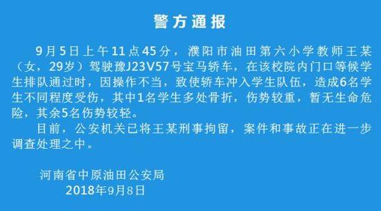 “中原油田警方”微信公众号9月8日通报,9月5日上午11点45分,濮阳市油田第六小学教师王某(女,29岁)驾驶豫J23V57号宝马轿车,在该校院内门口等候学生排队通过时,因操作不当,致使轿车冲入学生队伍,造成6名学生不同程度受伤,其中1名学生多处骨折,伤势较重,暂无生命危险,其余5名伤势较轻。