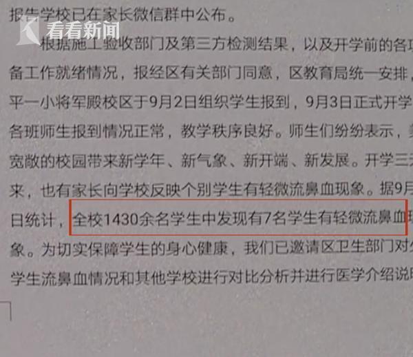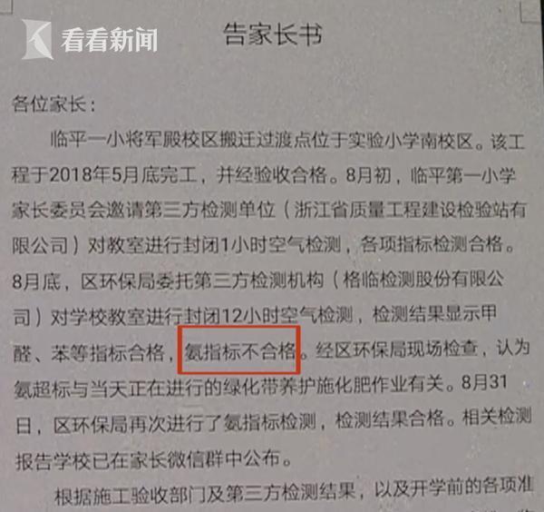 记者了解到,学校在家长群里发了两次《告家长书》 。第一次是本周三发的,里面提到全校1430余名学生中发现有7名学生有轻微流鼻血现象。老校区改建,过渡期间借用了余杭实验小学南校区,这里在今年5月 底工程完工并验收合格。其中8月初学校邀请第三方检测单位对教室进行封闭1小时空气检测,各项指标检测合格。8月底由余杭区环保局委托第三方检测机构对学校教室进行封闭12小时空气检测,检测结果显示甲醛,苯等指标合格,氨指标不合格。8月31号再次检测,氨指标合格。