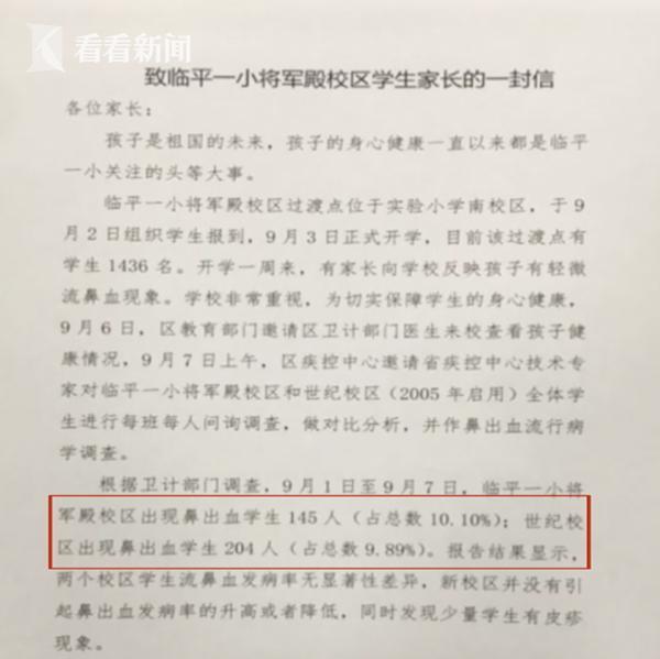 9月8日下午4点26分,学校在微信公众号发布了给家长的一封信。信中介绍,9月7号由省疾控中心技术专家对临平一小将军殿校区和世纪校区全体学生进行每班每人询问调查。其中临平一小将军殿校区出现鼻出血学生上升到145人,占总数10.1%,世纪校区出现鼻出血学生204人,占总数9.89%,新老校区发病率无明显差异,新校区并没有引起鼻出血发病率的升高或者降低。