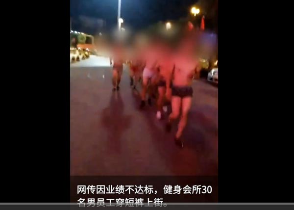 10月1日晚,广东江门。30多名男子穿着内裤暴走,引起众多人围观。据了解,他们是健身会所的销售人员,因业绩不达标受罚。会所经理表示,员工会欣然接受惩罚,女员工会被罚做俯卧撑。