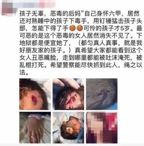据了解,这个女子,也就是孩子的继母在早上凌晨4点多的时候,孩子还正在睡梦中的时候,继母就拿着小榔头用力敲击孩子的头部,致男童的头上多处受伤,当孩子痛得要哭的时候,继母告诉他“不准哭”,就这样小男孩被继母吓得没有哭,在血泊中躺了两个小时,还是冯先生早上七点多的时候才发现孩子的床上到处是血的,然后把孩子紧急送进了医院,目前孩子还在医院接受治疗,那个继母也已经被警方控制住了。