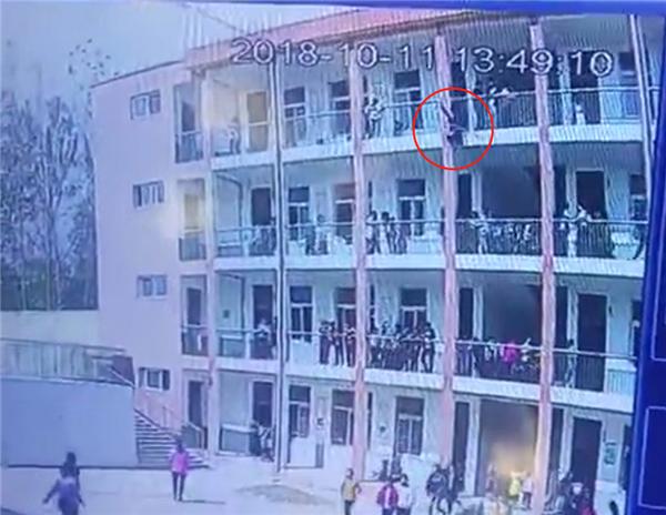记者从视频中可以看到13时49分05秒时,杨某开始趴在教室外的护栏上并有向下弯腰动作,49分10秒头朝下坠楼,坠楼时差点砸着地面上的同学,当时,楼上楼下以及地面上还有很多学生,有不少学生目睹了杨某坠楼的过程。
