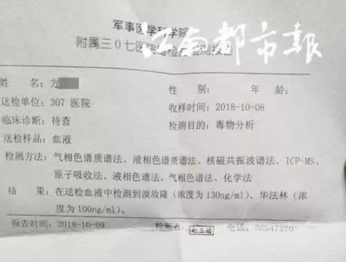 在小方家人提供的军事医学科学院附属三0七医院毒剑检室出具的血液检测报告中,结果显示在送检血液中检测到溴敌隆(浓度为130ng/ml)、华法林(浓度为100ng/ml)。