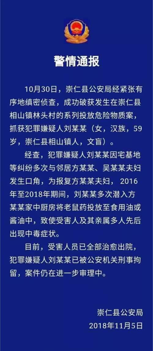 民警经过详细梳理发现,小方一家被人投毒系同村人作案的可能性较大。经侦查和逐一排查,相山镇林头村村民刘某等人进入了民警的视线。