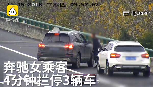 实拍安徽一奔驰女高速拦车借钱4分钟拦3辆车现场视频