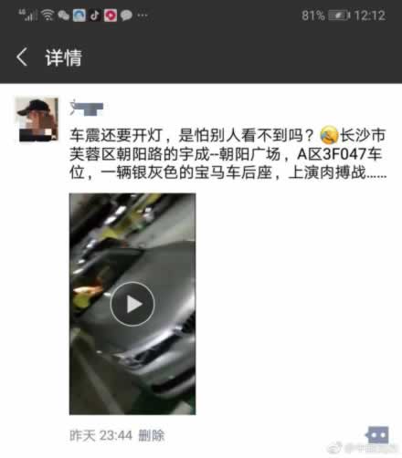 12月6日,一条“长沙车震门”的消息在微博流出,发布消息的人为一名粉丝过百万的加V博主。微博带有两张配图,一张疑为车震现场图,在一辆银色宝马车上,有一个裸露背影。还有一张是打了马赛克的朋友圈截图,截图显示,发布时间为23点44分,发朋友圈的人配文称,“一辆银灰色的宝马车后座,上演肉搏战……”,还透露事发地点在芙蓉区朝阳路的宇成朝阳广场A区。