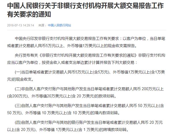 据《北京青年报》报道,2019年1月1日之后,中国境内个人使用第三方支付机构单日现金收支达到5万元人民币以上;当日单笔或者累计交易人民币200万元以上;及境内转账50万元人民币,或跨境转账20万元人民币以上,支付机构都要向中国央行提交大额交易报告。