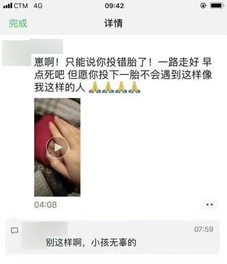 这张微信朋友圈截图写到:“崽啊!只能说你投错了胎!一路走好,早点死吧。但愿你投下一胎不会遇到这样像我这样的人。”