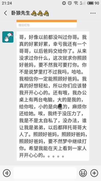 1月15日,王浩哥哥王飞飞给北青报记者发来的截图显示,王浩在信息里说,“幸亏我还有一个哥哥,以后爸妈交给你了,求你照顾好爸妈。”王浩还称他终于没压力了,以后都拜托哥哥了。王飞飞称,从1月8日凌晨接到王浩的信息以来,王浩已经失踪一周。1月8日当天,他就已经到上海,在刚失踪的时候,王飞飞称打王浩电话还能打通但没人接,最近几天王浩手机一直是关机状态。王飞飞到学校后找到了王浩的女朋友和其他同学,通过询问得知王浩可能是因为毕业论文以及找工作的压力,才做出这样的举动。