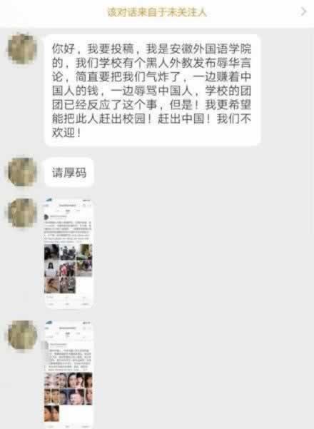 1月12日,网曝安徽外国语学院一名黑人外教曾多次在社交平台发布不当言论,恶意诋毁中国人。14日,安徽外国语学院国际交流中心工作人员表示,已有学生反映情况,目前正在核实调查中。
