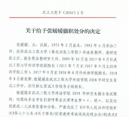据新京报此前报道,2018年11月14日、19日,武汉工程大学先后发布《关于给予张媛媛撤职处分的决定》和《关于给予张媛媛降低专业技术等级处分的决定》。文件显示:张媛媛在外语学院2018年研究生招生复试期间,违规向多名考官打招呼要求关照两名考生,还违规修改二人试卷答案和分数,决定给予张媛媛撤职处分以及降低岗位等级处分。