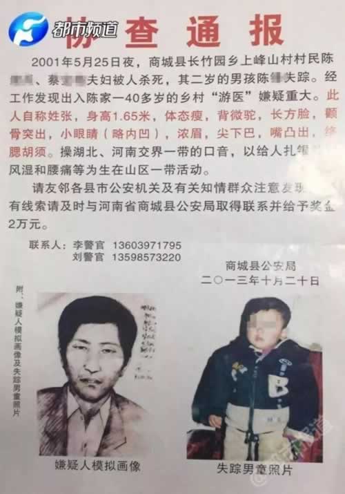 2001年5月26日,河南省信阳市商城县长竹园乡上峰山村发生一起命案,村民陈绪兵夫妇遇害。案发后,商城县公安局勘验发现,上身赤裸的陈绪兵俯卧在床,无反抗痕迹,疑似在扎银针时遇害。妻子蔡金梅遭到钝器击打头部,死在隔壁另一间屋里,现场遗留有银针、砖头和锄头,夫妻俩年仅1岁零8个月的儿子小峰和住在家里的一名乡村游医离奇失踪。