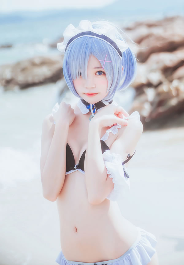 萝莉风COS桜桃喵–蕾姆COS外景比基尼写真