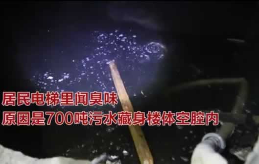 2月22日,一业主在负一楼发现有臭水从电梯地板周围渗进来,赶紧叫物业人员紧急关闭了电梯。打开电梯门发现电梯井下方的臭水将近两米深。2月28日,维修人员在负一层的承重墙上开一洞,发现楼体中的空腔处已积满臭水。据工程师估计,楼梯的积水约有七八百吨。目前,小区物业会同开发商的土建公司正在积极排水、排查之中。