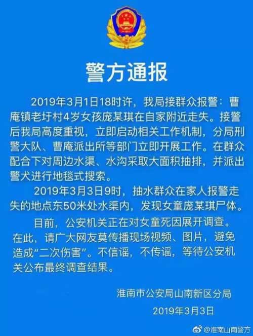 新京报快讯 安徽淮南山南警方今日(3日)通过官方微博发布通告:2019年3月1日18时许,我局接群众报警:曹庵镇老圩村4岁女孩庞某琪在自家附近走失。接警后淮南山南新区分局刑警大队、曹庵派出所等部门,在群众配合下对周边水渠、水沟采取大面积抽排,并派出警犬进行地毯式搜索。