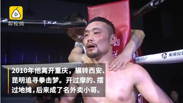 3月30日,重庆小伙张方勇战胜日本选手,帮助中国队赢得第四届中日拳王争霸赛。张方勇被称作“外卖拳王”,为支撑自己的拳王梦,他依然送外卖维持生活,他说像自己这样的拳手有很多,他只是这些草根中的一个代表。