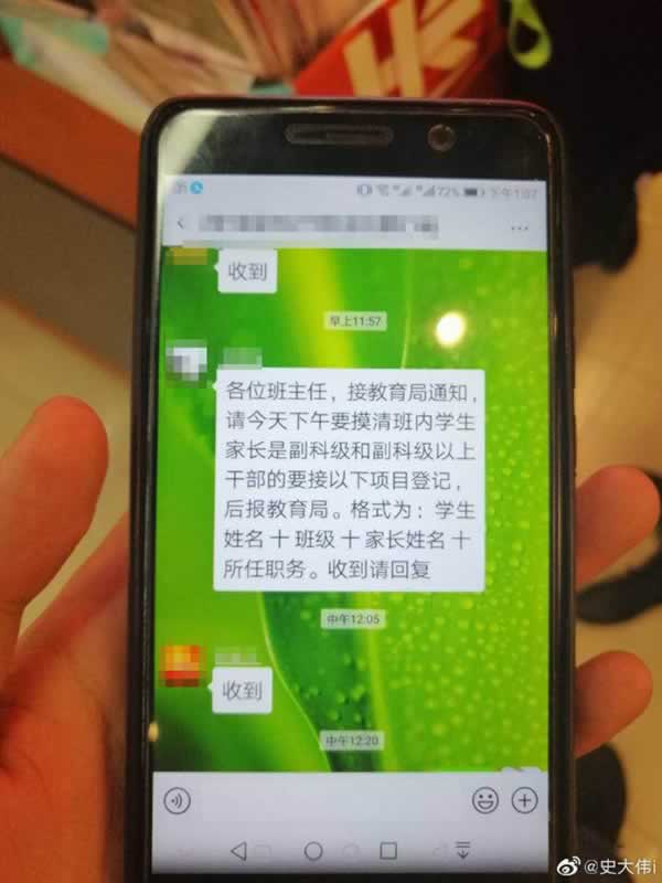 此前稍早时候,有微博用户发文称,山西朔州市朔城区第七中学要求初三年级班主任“摸清”学生家长任职,副科级和副科级以上的要进行登记上报。