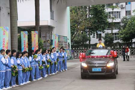 经过中、高考的人大都有过考前“百日誓师”的经历,不过,你见过像阅兵式一样的誓师典礼吗?3月19日,珠海七中举行百日誓师活动的照片在网络上流传,而场面居然与阅兵式颇有几分相似。据该校校长介绍,站在车上的学生是去年该校的毕业生,也是该校去年中考的“黑马”,此举一是以他们的经历来鼓舞本届毕业生,二也是兑现去年对中考“黑马”学生“战袍加身”的承诺。