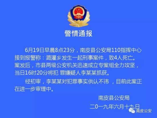 新京报快讯 据河北省沧州市南皮县公安局微信公众号消息,6月19日早晨8点23分,河北省南皮县公安局110指挥中心接到报警称:潞灌乡发生一起刑事案件,致4人死亡。案发后,市县两级公安机关迅速成立专案组全力攻坚,当日16时20分将犯罪嫌疑人李某某抓获。