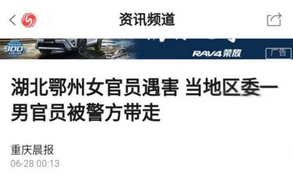 (原标题:湖北鄂州女干部遇害 当地区委一男干部被警方带走调查)