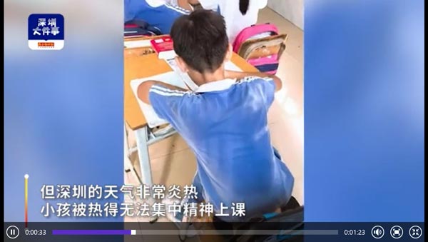 本周深圳天气多在30℃到33℃左右。深圳市宝安区宝华学校多位家长反映,宝华学校在退回100元空调费之后,从6月初起教室不开空调,有孩子在课间休息时间跑到老师办公室吹空调不出来,甚至有孩子中暑生病。中午午休时,还有男孩子脱掉上衣趴在桌上睡觉。但同时,老师办公室的空调是开着的。对此,宝华学校工作人员回应称,不开空调是因为教室用的变压器坏了,跟学校办公室不是共用一个变压器。学校至今仍未能找到有资质的单位维修和更换,争取在明年夏天让学生用上空调。