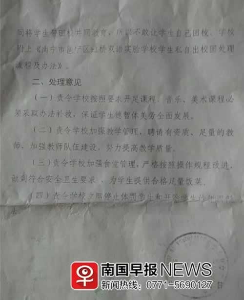 近日,邕宁区教育部门对该校进行调查,发现学校有体罚学生的情况,且存在教师配备不足、食堂卫生等问题。