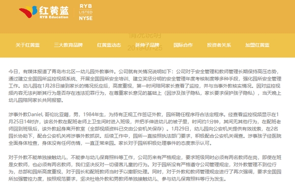 南都记者了解到,涉事幼儿园实为红黄蓝公司旗下一处园所。7月25日,红黄蓝公司在官网发布了一则情况说明回应此事。