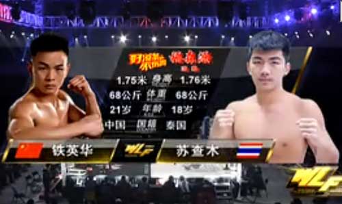 2015-03-28期武林风铁英华VS泰国苏查木, “小虎”压倒性重击大比分获胜。中国对泰国68公斤级比赛,蓝方苏查木 39战30胜。红方wlf武林风训练营,是擂台上最小的搏击选手,他叫小虎铁英华。目前战绩19战18胜1负3KO,全国65公斤级金腰带持有者。以上为比赛高清视频。以上为2015-03-28期武林风小虎铁英华KO苏查木视频,一起来欣赏。