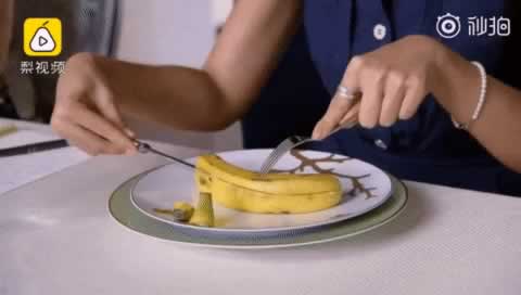 贵族的正确操作,是先用刀叉切掉香蕉两头,然后像做外科手术一样,用刀沿皮划开,剥出香蕉肉。