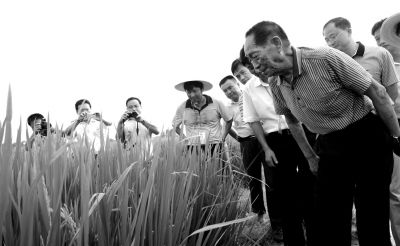 2013年7月30日,袁隆平院士在安徽省舒城县查看超级杂交稻长势。