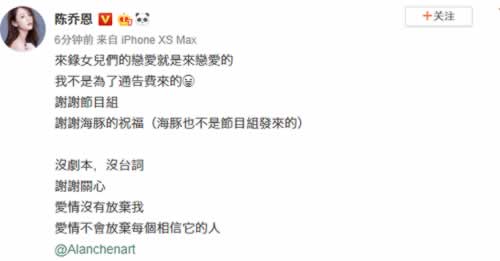 来录女儿们的恋爱就是来恋爱的,我不是为了通告费来的。谢谢节目组,谢谢海豚的祝福(海豚也不是节目组发来的),没剧本,没台词。谢谢关心。爱情没有放弃我。爱情不会放弃每个相信它的人。