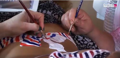 在《米兰体育报》公布的一段视频中,全程关注了罗斯人体彩绘制作的全过程。她先是穿着一套比基尼泳装拍照,然而彩绘师们按照那套比基尼的图案在她身体上进行创作,全过程持续将近10个小时。
