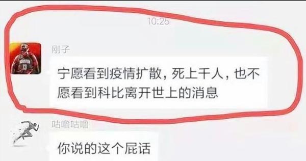 徐州男子微信称“宁愿疫情死千人不愿科比死” 被拘7日