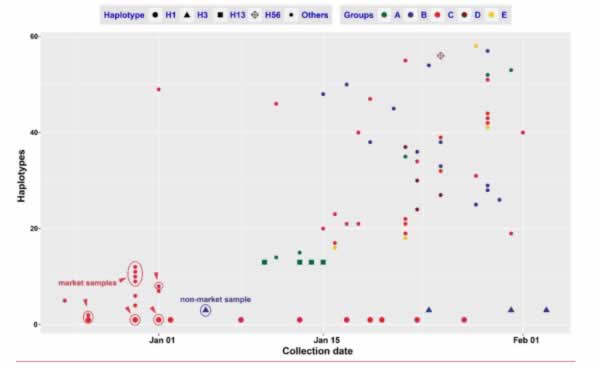 武汉现有的样本中没有一份编码A组中的单倍型。A组的单倍型在遗传上只与来自武汉的单倍型H3有联系(只有1份EPI_ISL_406801),但该病例与华南市场没有联系。值得注意的是,华南海鲜市场的所有的样品均有H1单倍型或其衍生(H2, H8-H12),说明该市场在短期内即发生了传播感染。