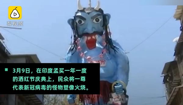 当地时间3月9日,印度孟买在一年一度的洒红节庆典上,将一尊代表新冠病毒的15米高怪物塑像进行火烧。当地人认为焚烧塑像象征着人们战胜了这种致命性病毒。
